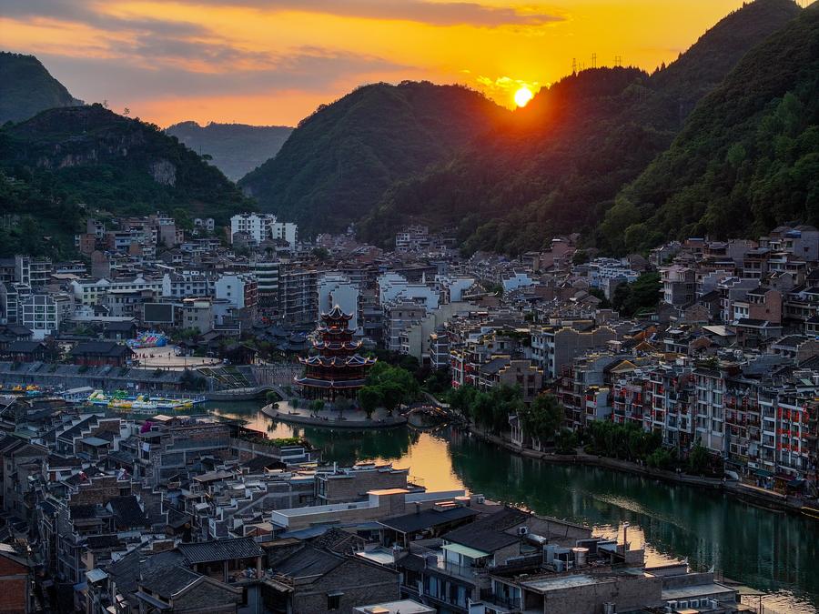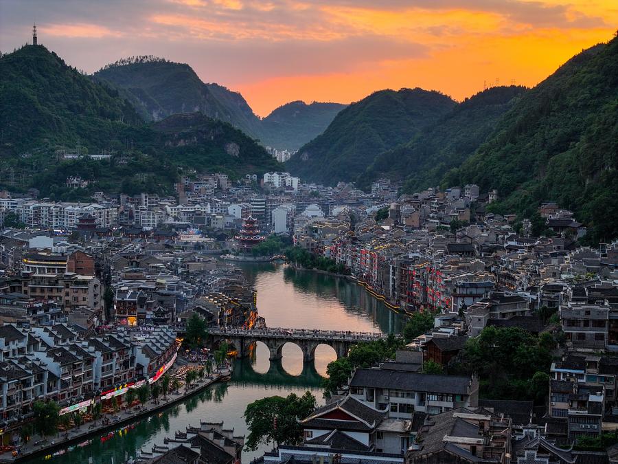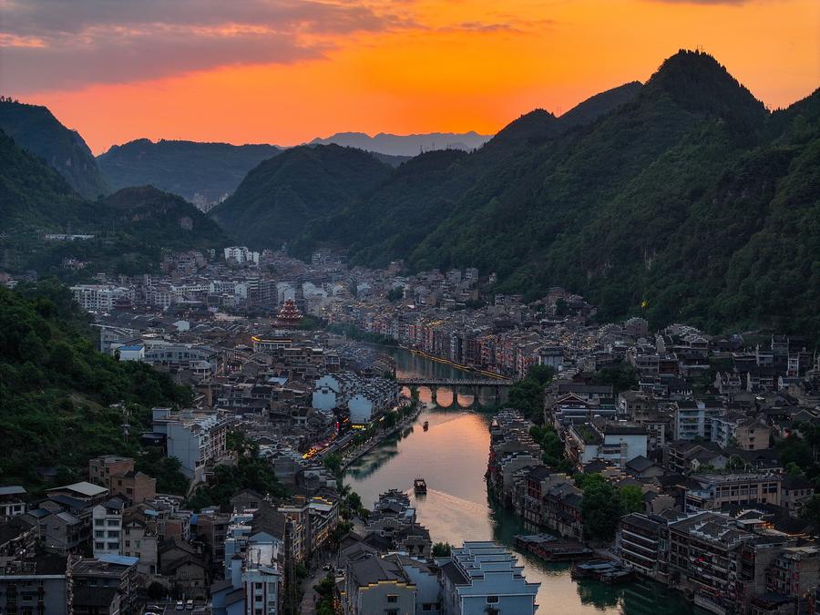 An aerial drone photo shows a sunset view of Zhenyuan ancient town in Qiandongnan Miao and Dong Autonomous Prefecture in southwest China's Guizhou Province, May 20, 2025. (Xinhua/Ou Dongqu)