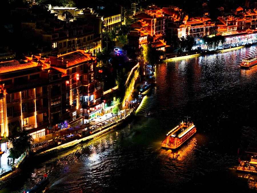 An aerial drone photo shows a night view of Zhenyuan ancient town in Qiandongnan Miao and Dong Autonomous Prefecture in southwest China's Guizhou Province, May 19, 2025. (Xinhua/Ou Dongqu)