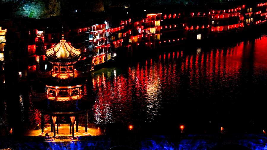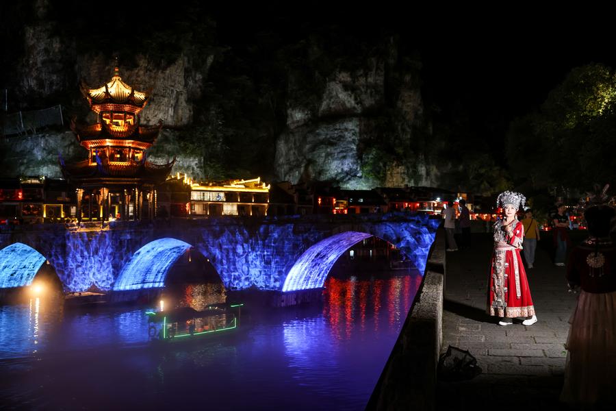 This photo shows a night view of Zhenyuan ancient town in Qiandongnan Miao and Dong Autonomous Prefecture in southwest China's Guizhou Province, May 20, 2025. (Xinhua/Ou Dongqu)