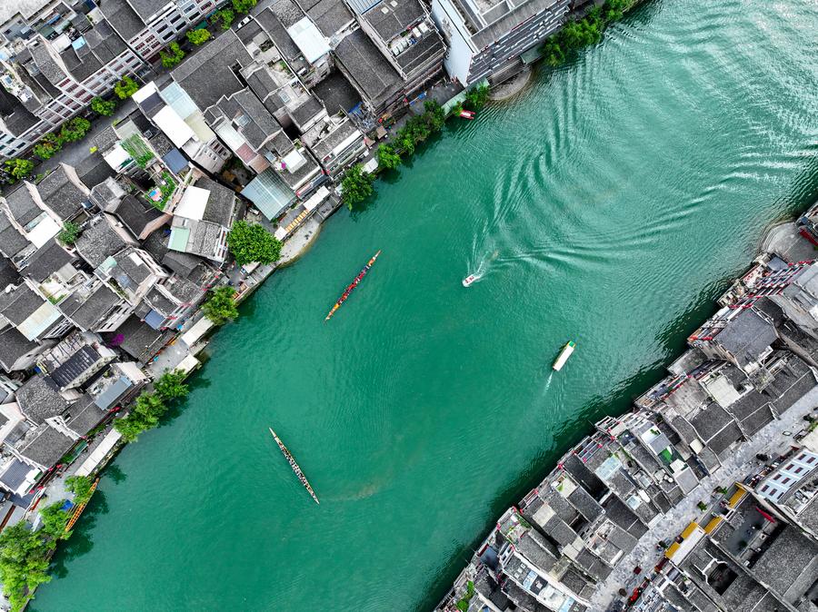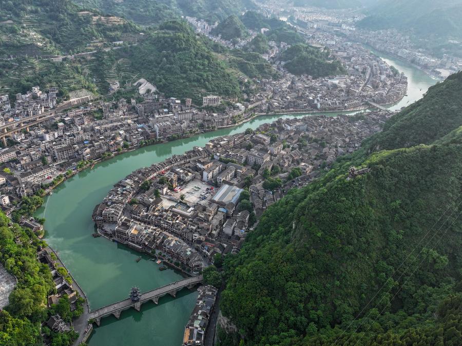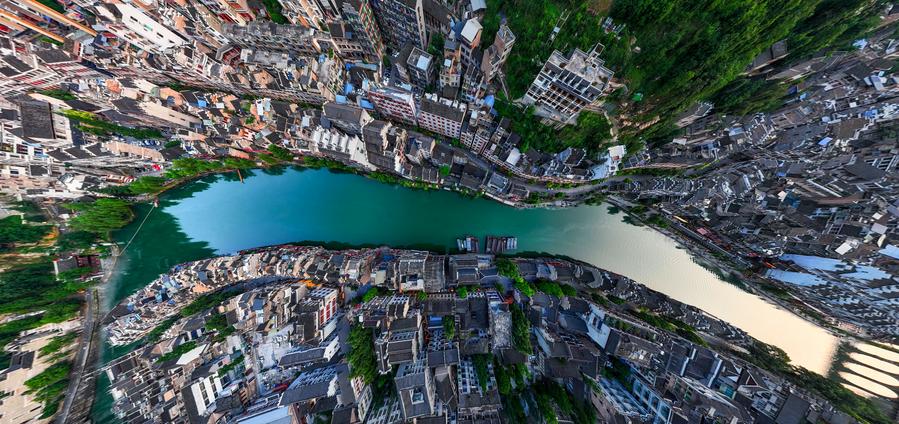 An aerial drone photo shows a view of Zhenyuan ancient town in Qiandongnan Miao and Dong Autonomous Prefecture in southwest China's Guizhou Province, May 20, 2025. (Xinhua/Ou Dongqu)