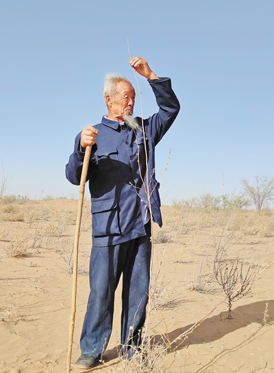 Wang Tianchang checks on the growth of a tree sapling at the southern edge of the Tengger Desert in Hongshui village, Changcheng town, Liangzhou district, Wuwei city, northwest China's Gansu Province. (People's Daily/Song Chao jun)