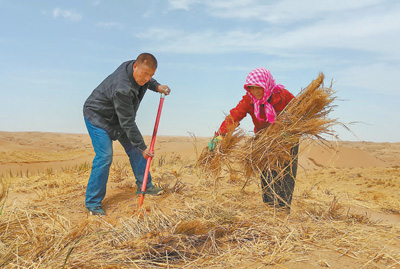 Wang Yinji and his wife place straw checkerboard sand barriers at the southern edge of the Tengger Desert in Hongshui village, Changcheng town, Liangzhou district, Wuwei city, northwest China's Gansu Province. (People's Daily/Song Chaojun)