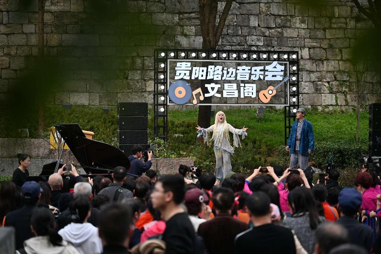 As dusk settled and the lights flickered on, the old city wall in Guiyang, southwest China's Guizhou province, began to glow. In front of the Wenchang Pavilion, a historical landmark, a musician strummed the opening chords of a guitar, starting a roadside concert.