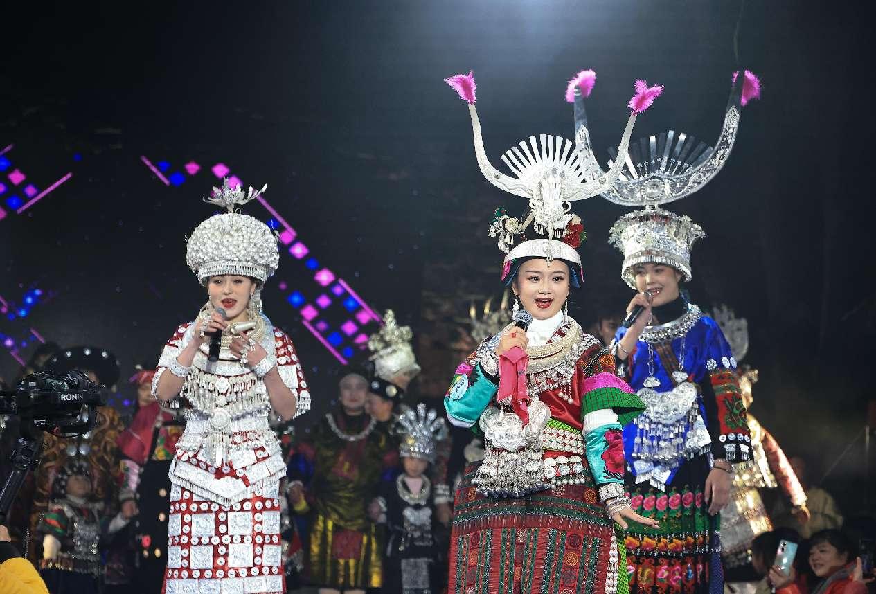 Performers clad in traditional ethnic costumes sing at a roadside concert held near the Wenchang Pavilion in Yunyan district, Guiyang, southwest China's Guizhou province, January 1, 2025. (Photo by Zhang Hui/People's Daily Online)