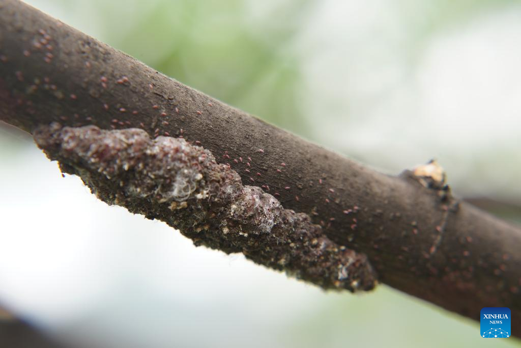 This photo taken on May 14, 2025 shows shellac and shellac bugs in Yayi Town, Mojiang Hani Autonomous County of Pu'er City, southwest China's Yunnan Province. (Xinhua/Gao Yongwei)