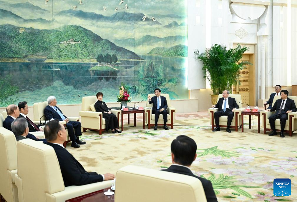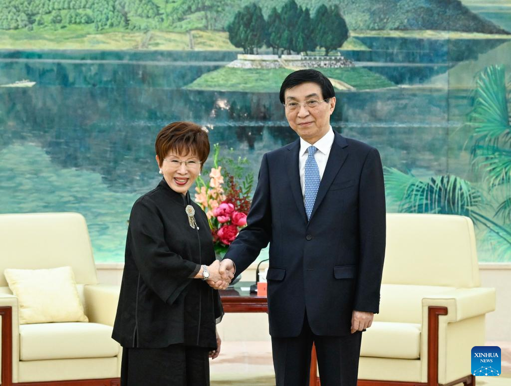 Wang Huning, a member of the Standing Committee of the Political Bureau of the Communist Party of China Central Committee and chairman of the National Committee of the Chinese People's Political Consultative Conference, meets with Taiwan guests, including Hung Hsiu-chu, former chairperson of the Chinese Kuomintang party, who are in Beijing to attend the second Cross-Strait Chinese Culture Summit, in Beijing, capital of China, May 27, 2025. (Xinhua/Shen Hong)