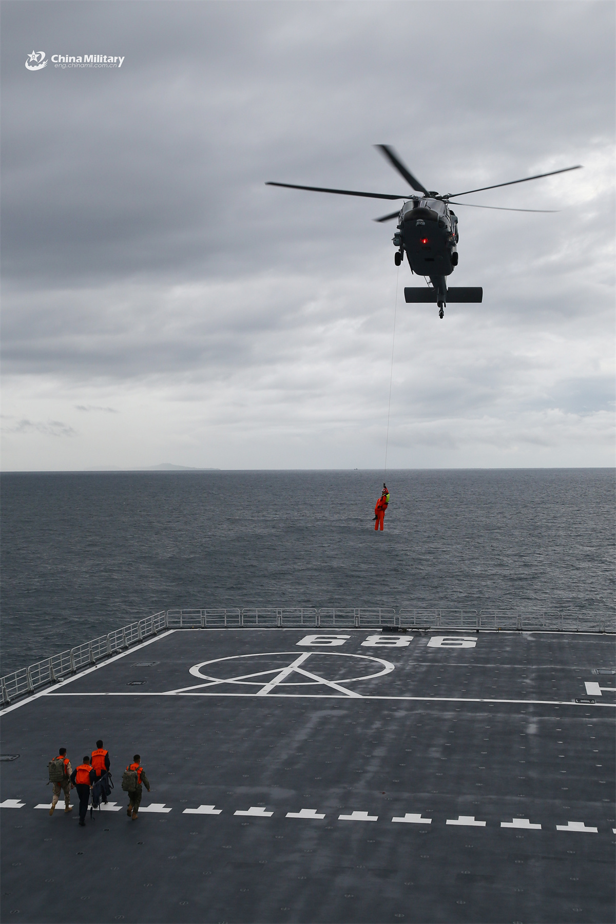The aerial and maritime live-force drills of the China-Cambodia "Golden Dragon 2025"joint exercise kicked off in the sea area and airspace near the port of Sihanoukville in Cambodia on May 26, 2025. The picture shows a ship-borne helicopter transferring the wounded to the Chinese amphibious dock landing ship Changbaishan (Hull 989). (eng.chinamil.com.cn/Gan Jun)