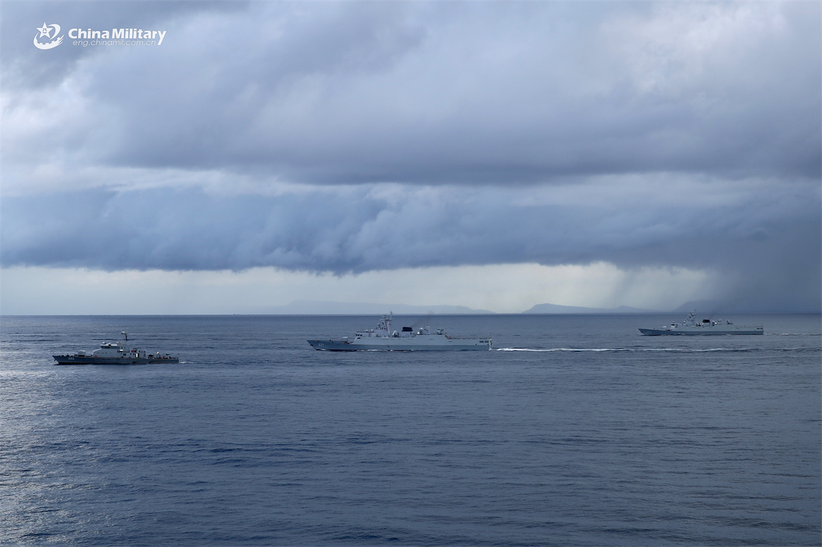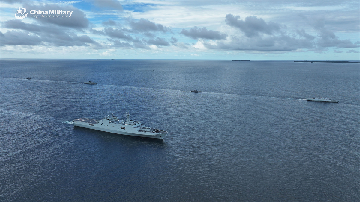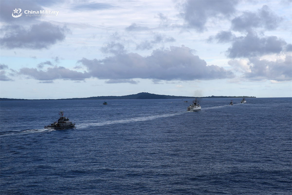 The aerial and maritime live-force drills of the China-Cambodia "Golden Dragon 2025"joint exercise kicked off in the sea area and airspace near the port of Sihanoukville in Cambodia on May 26, 2025. The picture shows joint taskforce comprising Chinese and Cambodian naval vessels steaming in formation to the designated sea area. (eng.chinamil.com.cn/Gan Jun)