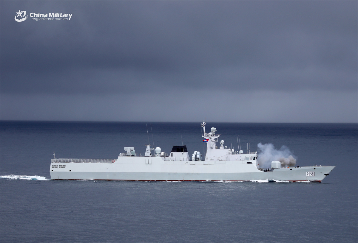 The aerial and maritime live-force drills of the China-Cambodia "Golden Dragon 2025"joint exercise kicked off in the sea area and airspace near the port of Sihanoukville in Cambodia on May 26, 2025. The picture shows the Chinese guided-missile frigate Panzhihua (Hull 621) firing its main-gun at mock sea targets. (eng.chinamil.com.cn/Gan Jun)