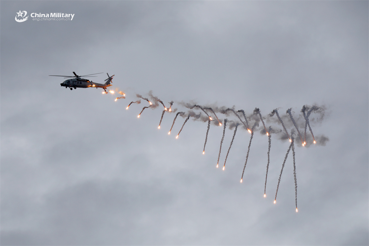 The aerial and maritime live-force drills of the China-Cambodia "Golden Dragon 2025"joint exercise kicked off in the sea area and airspace near the port of Sihanoukville in Cambodia on May 26, 2025. The picture shows a Chinese helicopter releasing thermal decoy bombs for interference and concealment. (eng.chinamil.com.cn/Gan Jun)