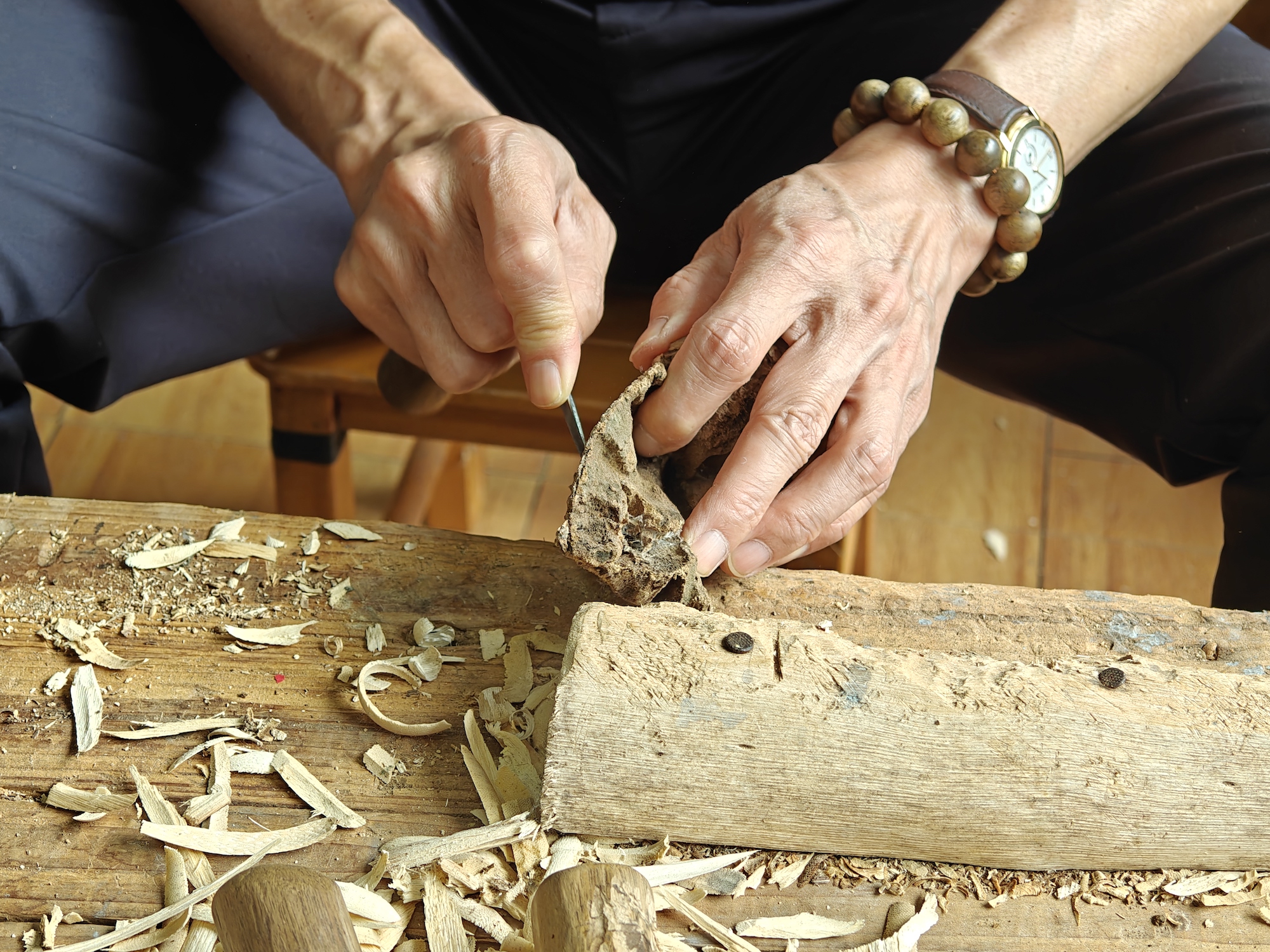 Huang Ou, a representative inheritor of the national intangible cultural heritage "Guanxiang-Making Techniques," demonstrates the art of refining agarwood. (People's Daily Online/ Wang Yadie)