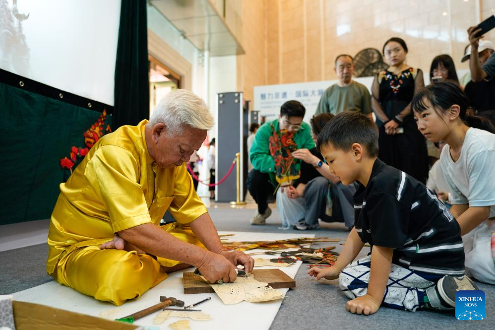 An artisan makes Malaysian shadow puppets during the 9th International Festival of the Intangible Cultural Heritage held in Chengdu, southwest China's Sichuan Province, May 28, 2025. The festival kicked off here on Wednesday, during which over 600 items of intangible cultural heritage from more than 60 countries and regions will be displayed. (Xinhua/Xu Bingjie)
