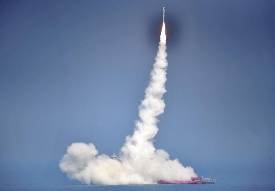 A CERES-1 carrier rocket carrying four satellites blasts off from the waters near east China's Shandong Province, May 19, 2025. (Xinhua/Guo Xulei)