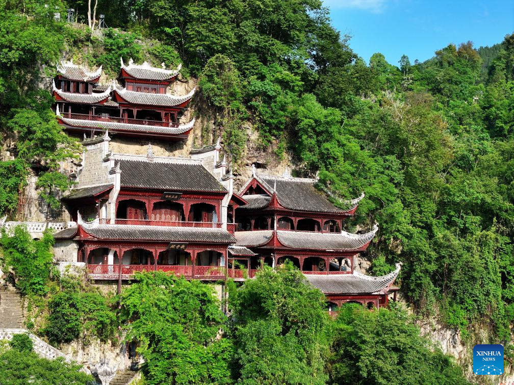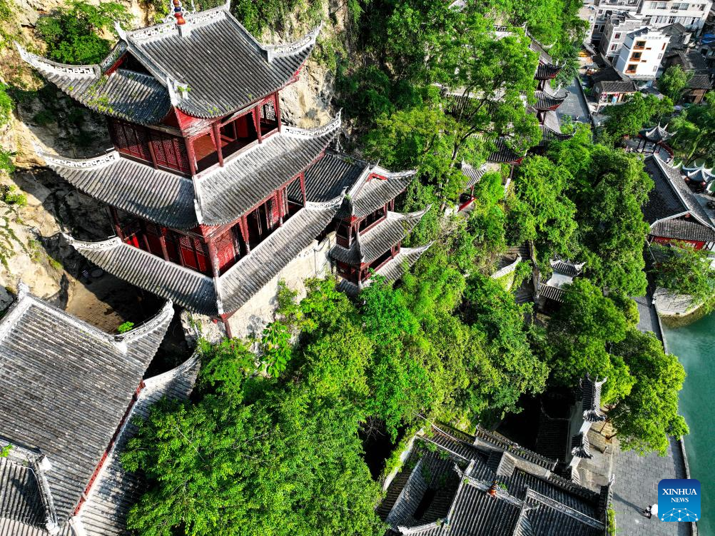An aerial drone photo taken on May 19, 2025 shows a view of Qinglong Cave Complex built on the cliff in Zhenyuan ancient town in Qiandongnan Miao and Dong Autonomous Prefecture in southwest China's Guizhou Province. The architectural complex, located on a 300-meter-long and 80-meter-high cliff, is a model of the integration of architectural characters between the north and the south of China. (Xinhua/Ou Dongqu)