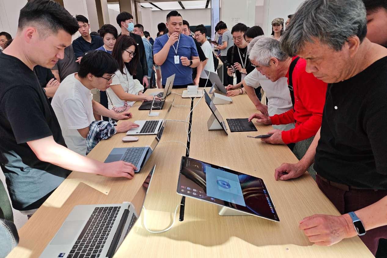 Visitors explore the foldable laptop Matebook Fold at a Huawei store, east China's Shanghai, May 19, 2025. (Photo by Wang Gang/People's Daily Online)