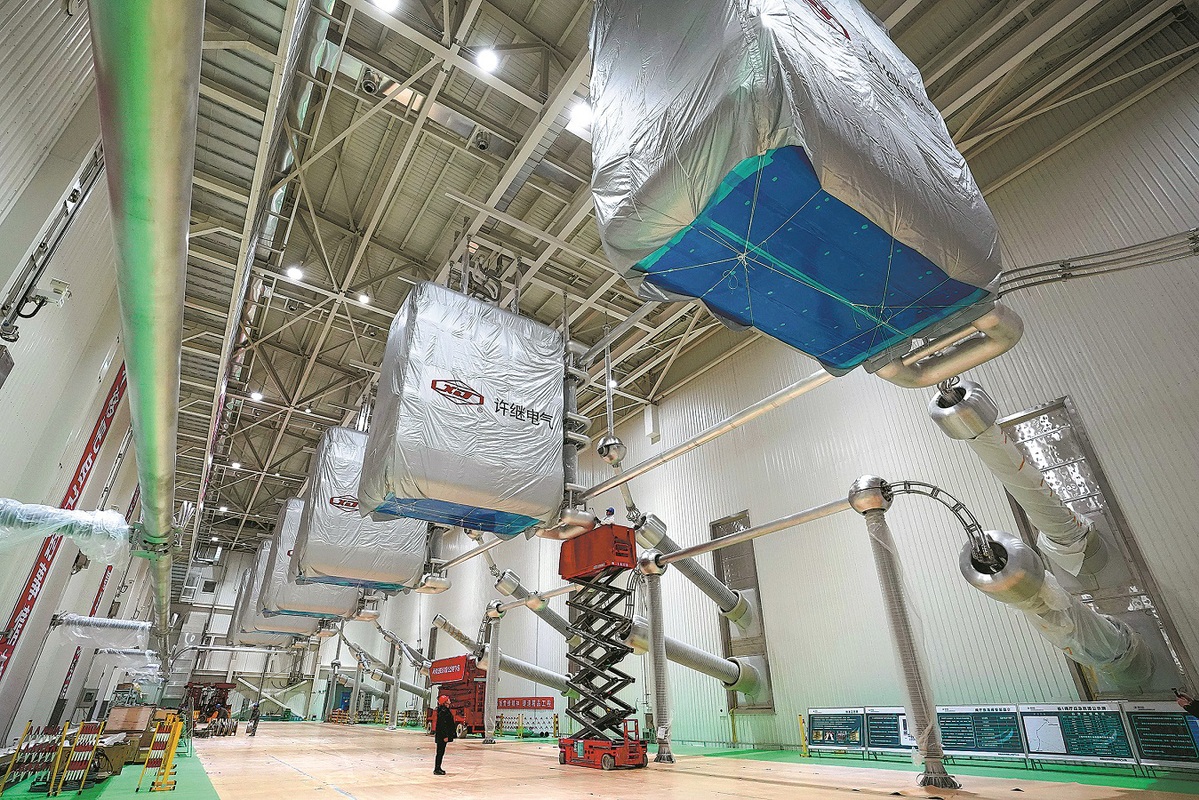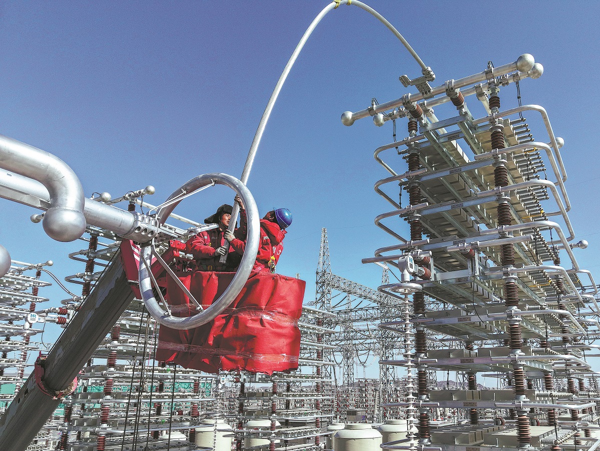 Workers install lead wires for the capacitor bank equipment at Balikun converter station in March. (Ding Lei/Xinhua)