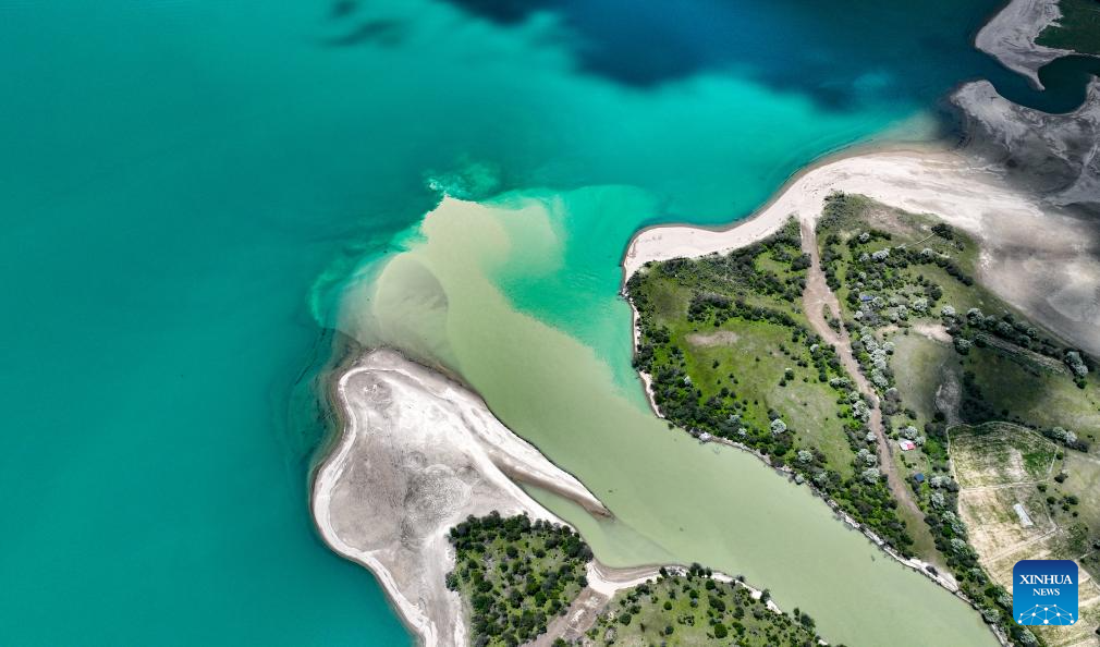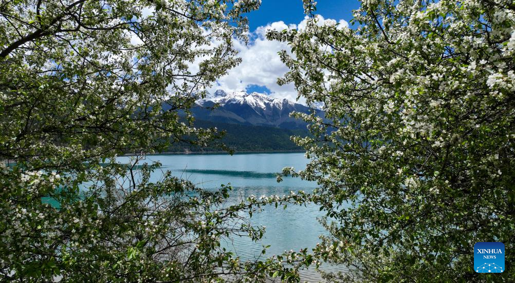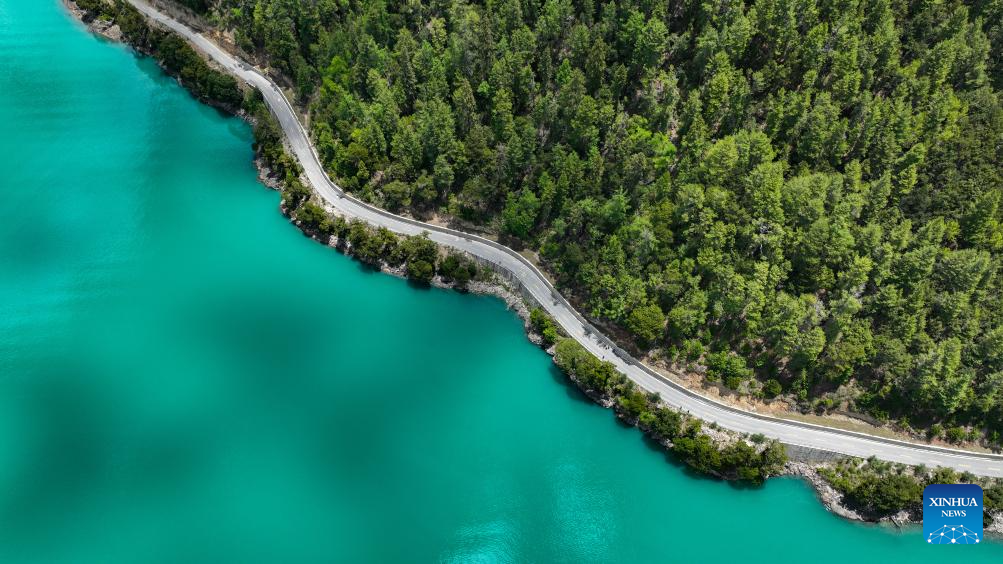 This drone photo taken on May 28, 2025 shows a view of Basum Tso, a lake in Nyingchi, southwest China's Xizang Autonomous Region. This lake nestled among snow-covered mountains is noted for limpid water and diversified vegetation, and has been a tremendous tourist attraction during the summer. (Xinhua/Jigme Dorje)