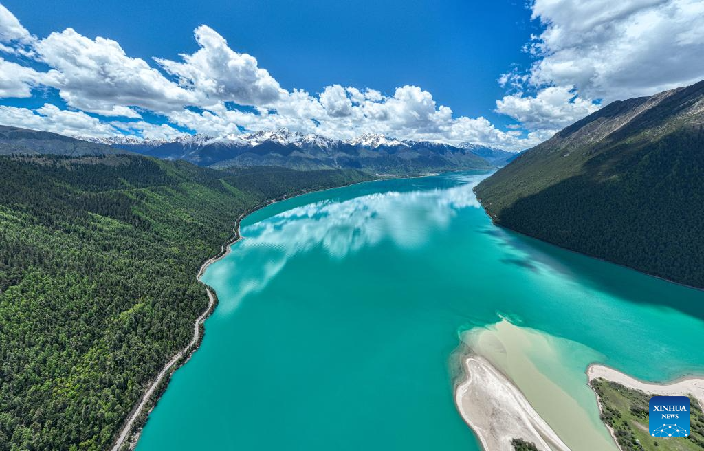 An aerial drone photo taken on May 28, 2025 shows a view of Basum Tso, a lake in Nyingchi, southwest China's Xizang Autonomous Region. This lake nestled among snow-covered mountains is noted for limpid water and diversified vegetation, and has been a tremendous tourist attraction during the summer. (Xinhua/Jigme Dorje)
