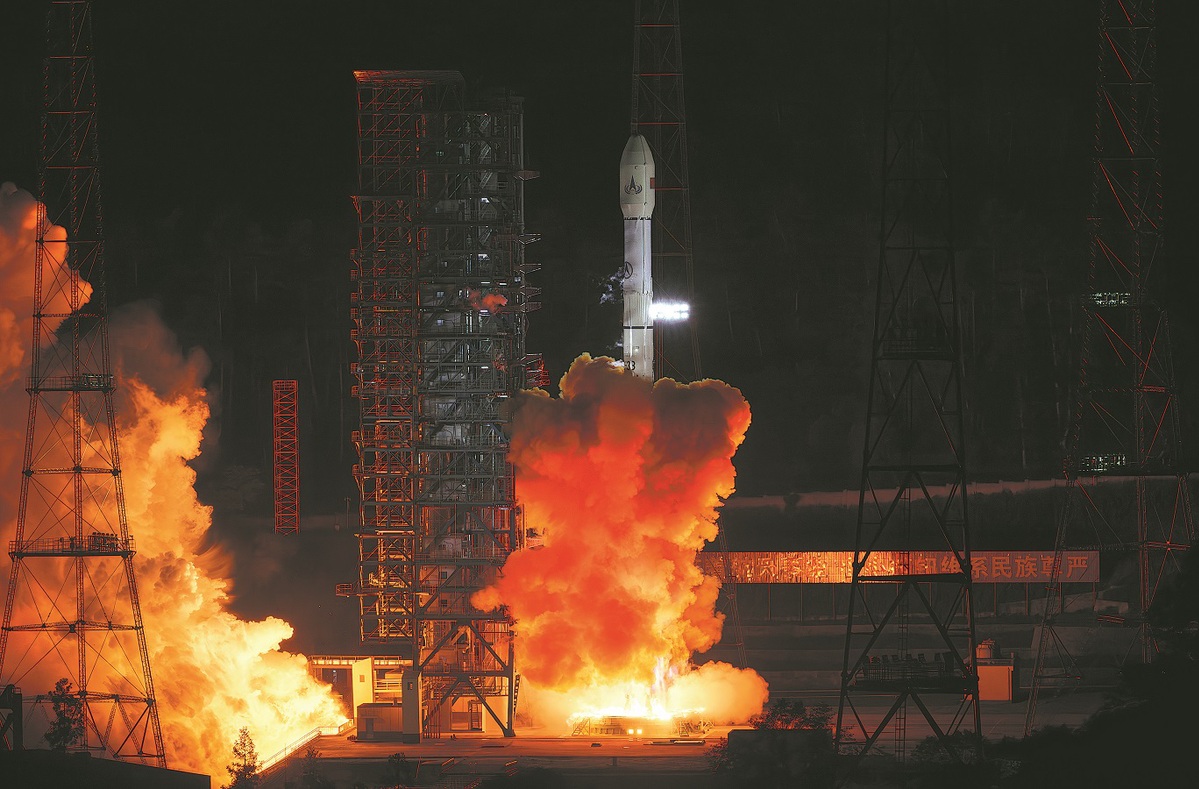A Long March 3B carrier rocket blasts off from the Xichang Satellite Launch Center in Sichuan province at 1:31 am on Thursday, sending the Tianwen 2 probe into a transfer orbit from Earth to the asteroid 2016 HO3 about 18 minutes later. (Cai Yang/Xinhua)
