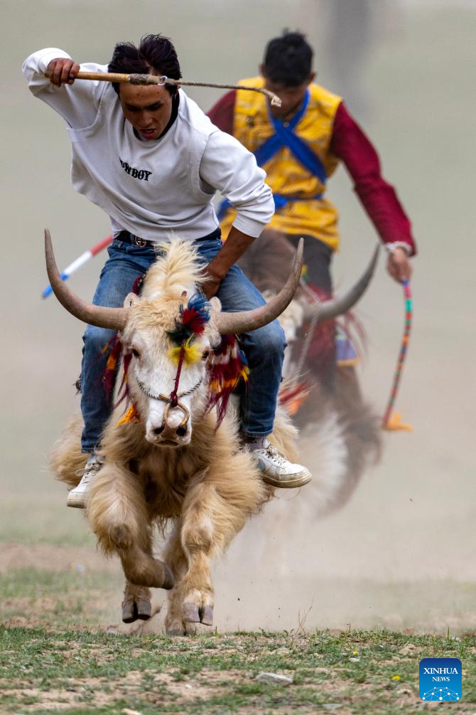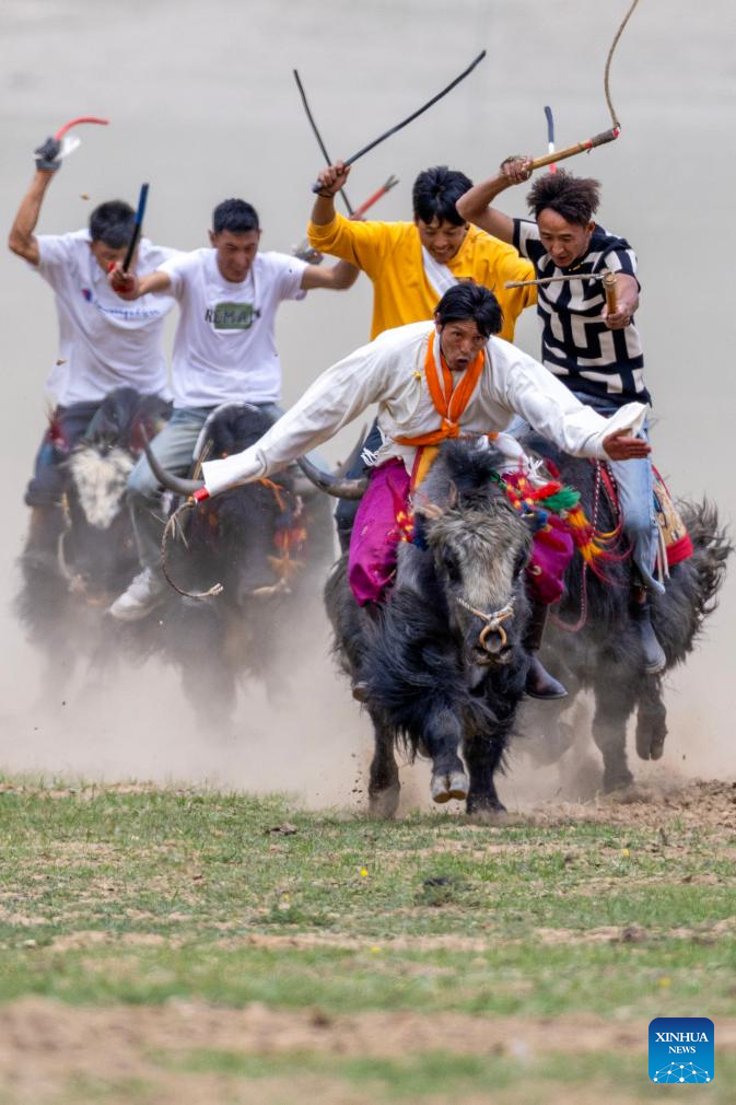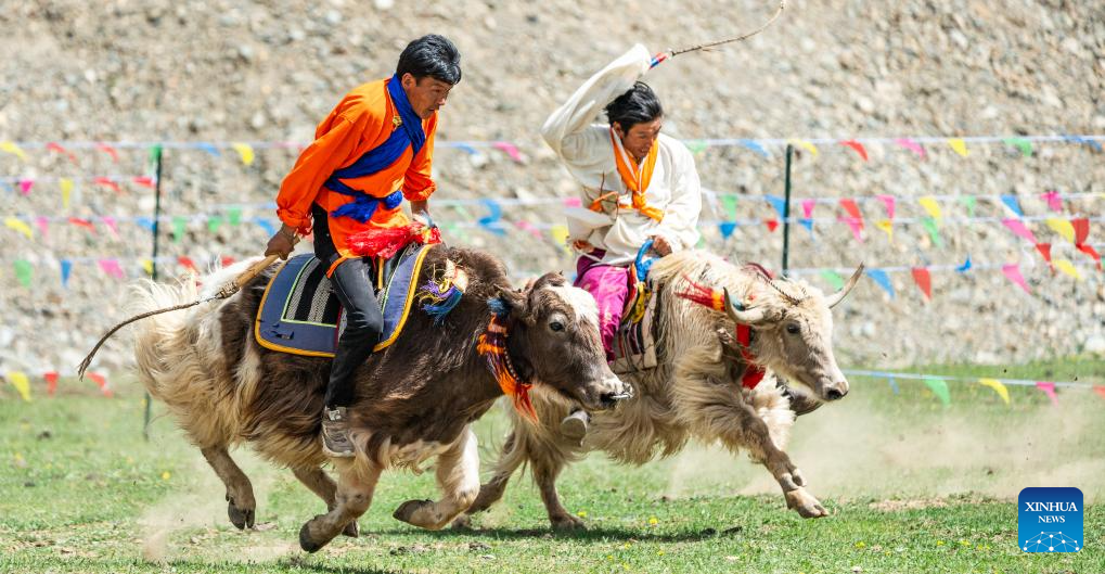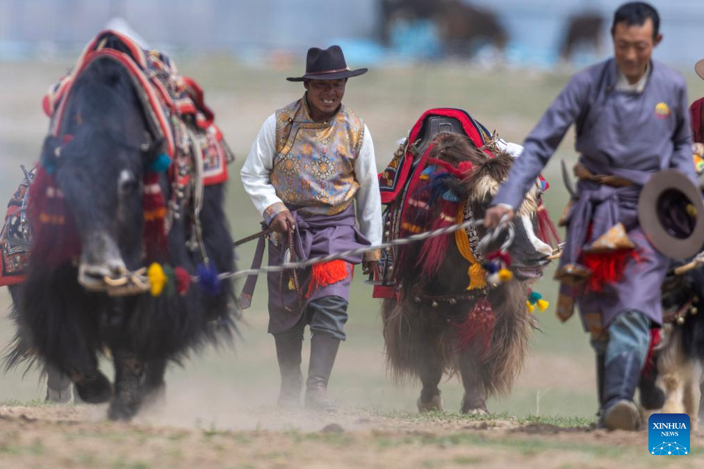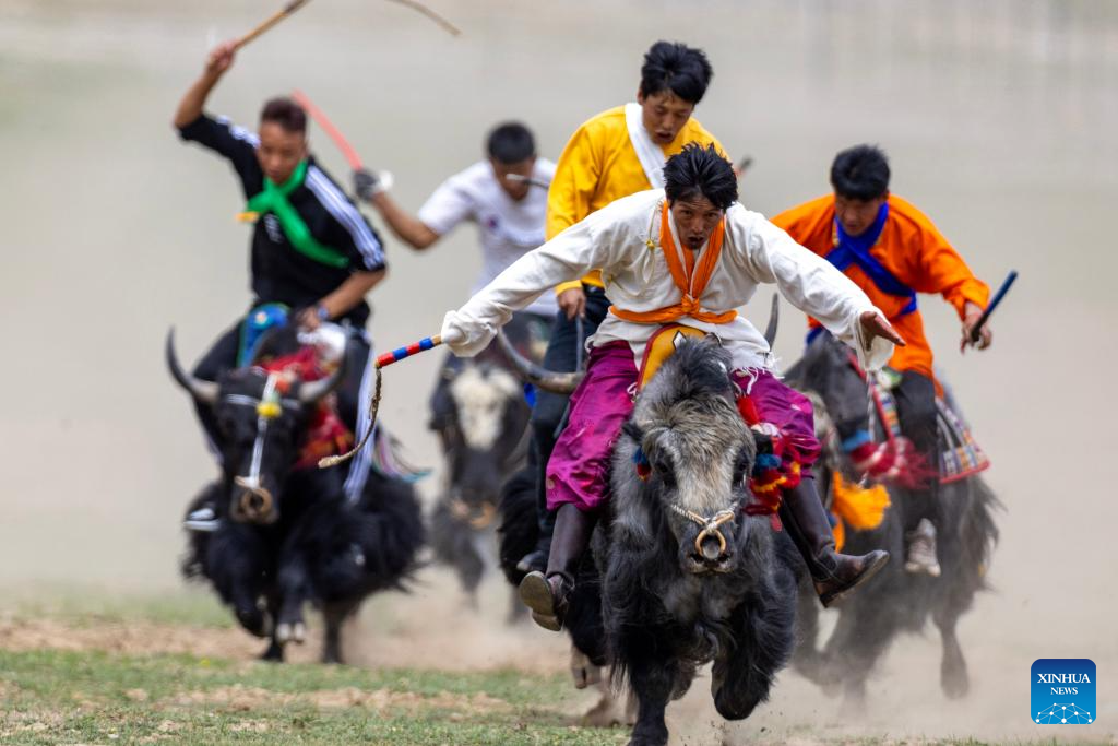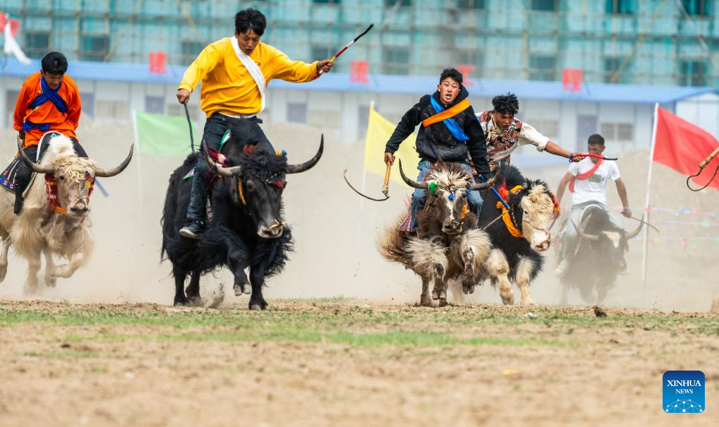 Herdsmen take part in a traditional yak racing in Lhasa, southwest China's Xizang Autonomous Region, May 29, 2025. Herdsmen and a total of 132 yaks participated in the traditional yak racing in Lhasa on Thursday, attracting many local spectators. (Xinhua/Tenzin Nyida)
