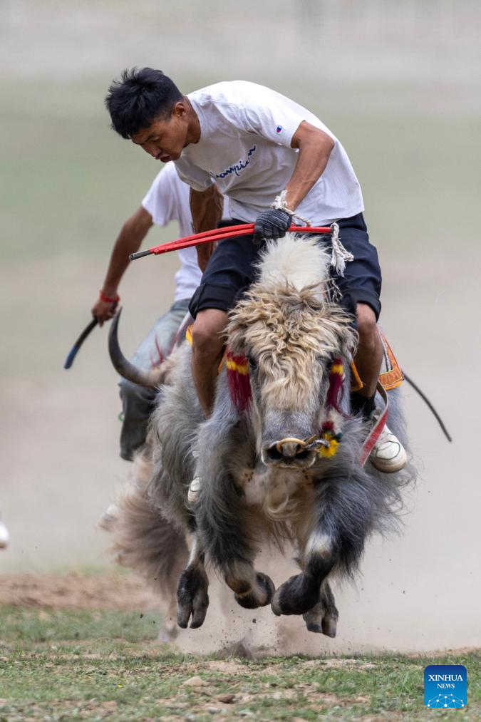 A herdsman competes in a traditional yak racing in Lhasa, southwest China's Xizang Autonomous Region, May 29, 2025. Herdsmen and a total of 132 yaks participated in the traditional yak racing in Lhasa on Thursday, attracting many local spectators. (Xinhua/Jiang Fan)