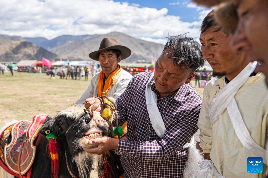 A staff member examine the yak's teeth to determine its eligibility for the race before a traditional yak racing in Lhasa, southwest China's Xizang Autonomous Region, May 29, 2025. Herdsmen and a total of 132 yaks participated in the traditional yak racing in Lhasa on Thursday, attracting many local spectators. (Xinhua/Tenzin Nyida)