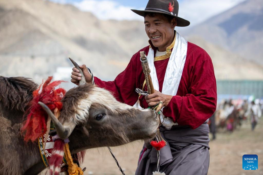 A herdsman comforts his yak before a traditional yak racing in Lhasa, southwest China's Xizang Autonomous Region, May 29, 2025. Herdsmen and a total of 132 yaks participated in the traditional yak racing in Lhasa on Thursday, attracting many local spectators. (Xinhua/Jiang Fan)