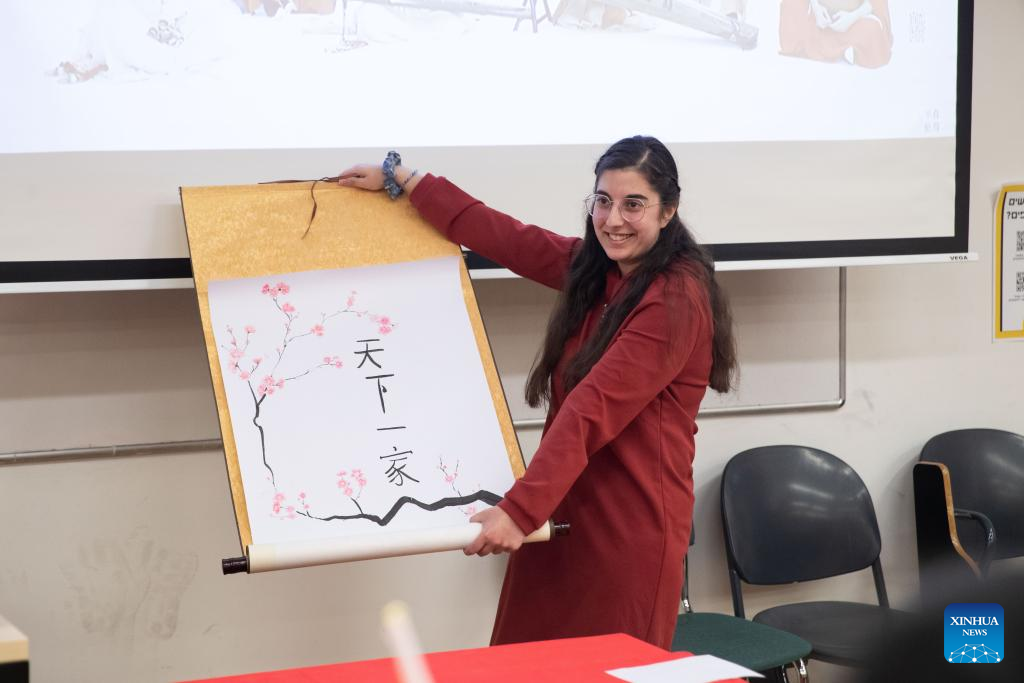 A participant demonstrates calligraphy during the 24th "Chinese Bridge" Chinese proficiency competition for Israeli university students, in Jerusalem, on May 29, 2025. (Xinhua/Chen Junqing)
