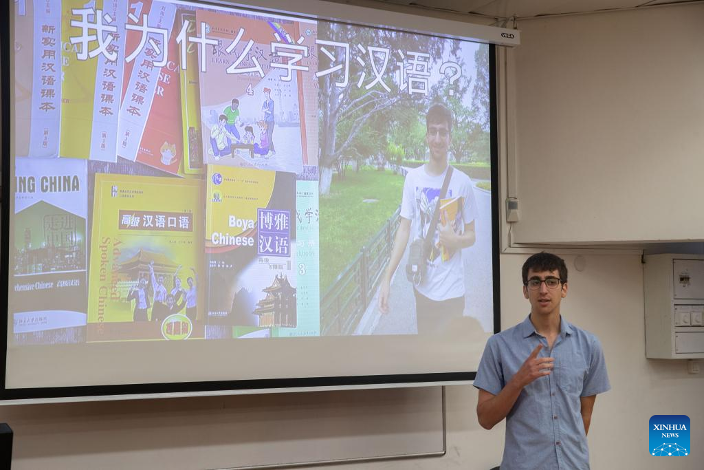 Alon Shoval from the Hebrew University of Jerusalem gives a speech during the 24th "Chinese Bridge" Chinese proficiency competition for Israeli university students, in Jerusalem, on May 29, 2025. (Xinhua/Chen Junqing)
