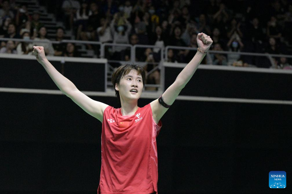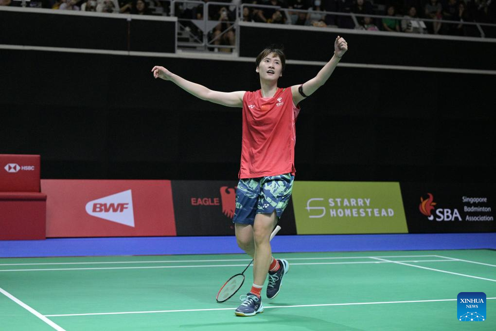 Chen Yufei of China celebrates after winning the women's singles quarterfinal against An Se-young of South Korea at the Singapore Badminton Open 2025 in Singapore, May 30, 2025. (Photo by Then Chih Wey/Xinhua)
