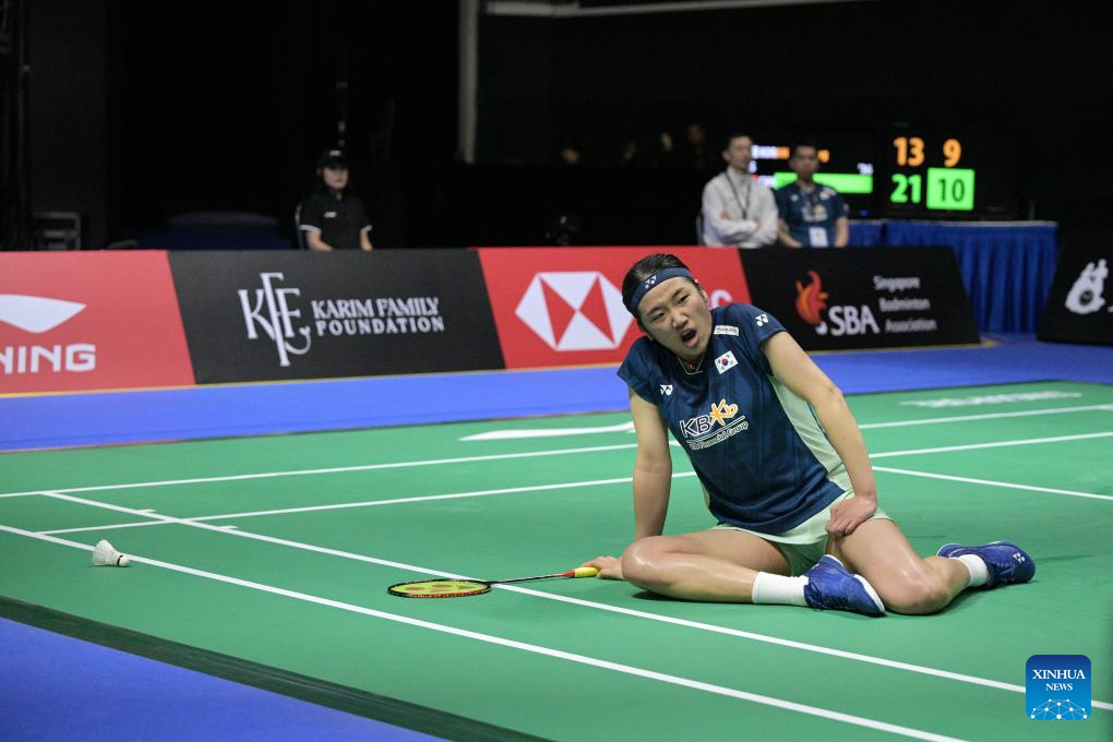 An Se-young of South Korea reacts during the women's singles quarterfinal against Chen Yufei of China at the Singapore Badminton Open 2025 in Singapore, May 30, 2025. (Photo by Then Chih Wey/Xinhua)