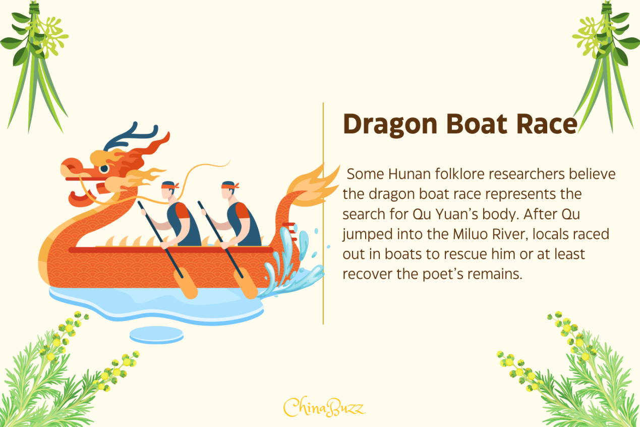 Some Hunan folklore researchers believe the dragon boat race represents the search for Qu Yuan's body. After Qu jumped into the Miluo River, locals raced out in boats to rescue him or at least recover the poet's remains.