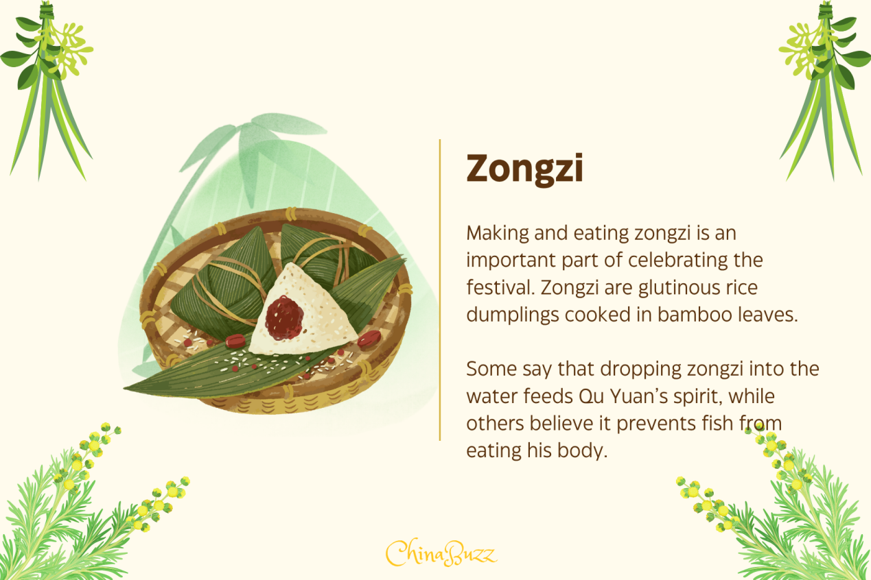 Making and eating zongzi is an important part of celebrating the festival. Zongzi are glutinous rice dumplings cooked in bamboo leaves. Some say that dropping zongzi into the water feeds Qu Yuan's spirit, while others believe it prevents fish from eating his body.