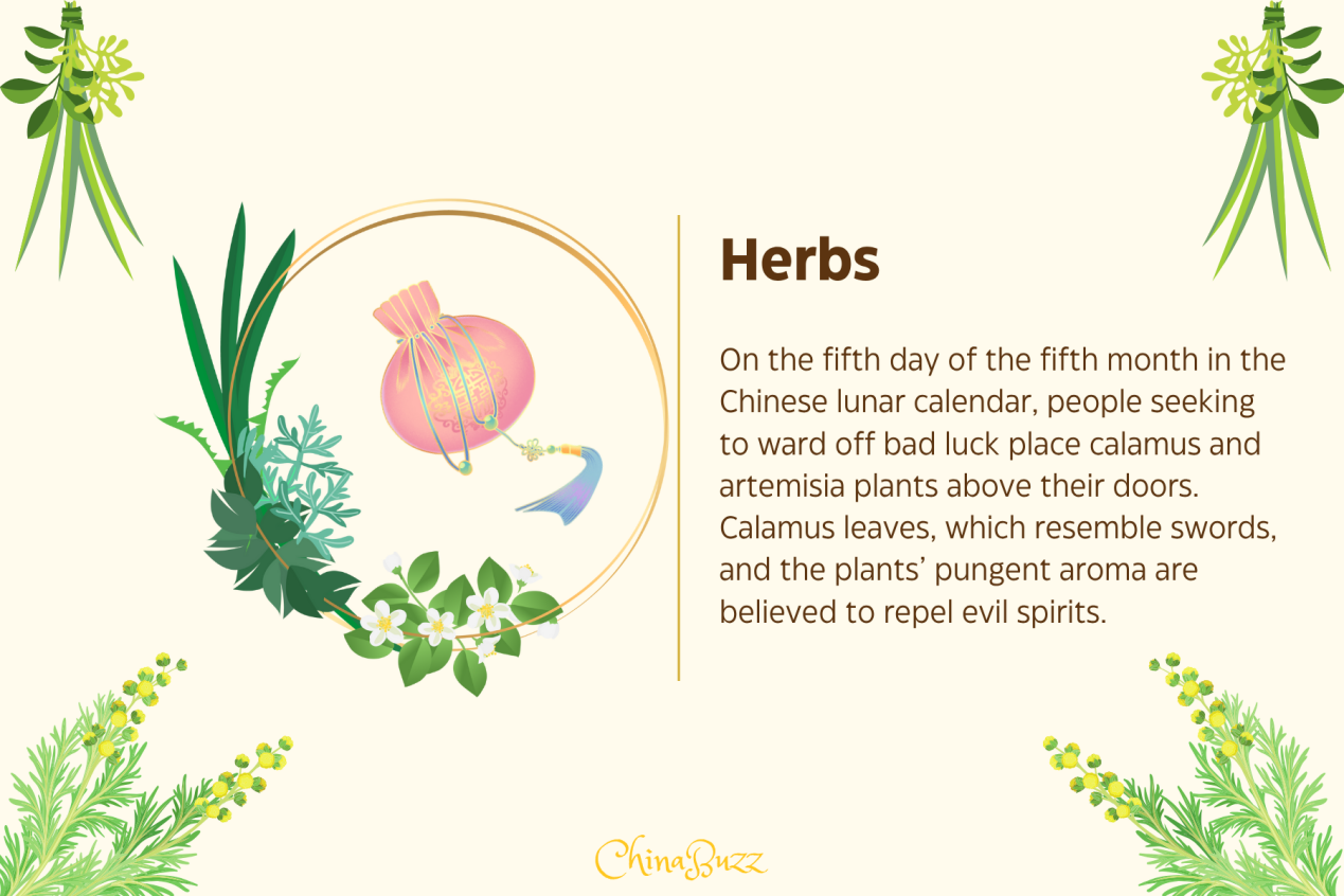 On the fifth day of the fifth month in the Chinese lunar calendar, people seeking to ward off bad luck place calamus and artemisia plants above their doors. Calamus leaves, which resemble swords, and the plants' pungent aroma are believed to repel evil spirits.