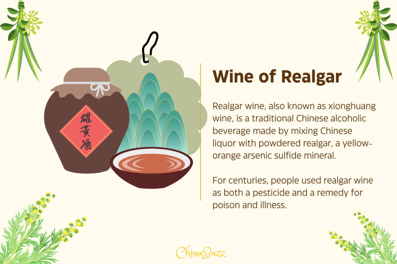 For centuries, people used realgar wine as both a pesticide and a remedy for poison and illness. During the Dragon Boat Festival, applying realgar wine to parts of children's faces is common to help ward off the five venomous creatures.