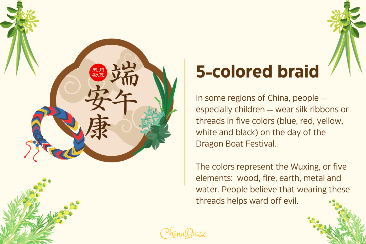 In some regions of China, people — especially children — wear silk ribbons or threads in five colors (blue, red, yellow, white and black) on the day of the Dragon Boat Festival. The colors represent the Wuxing, or five elements: wood, fire, earth, metal and water. People believe that wearing these threads helps ward off evil.