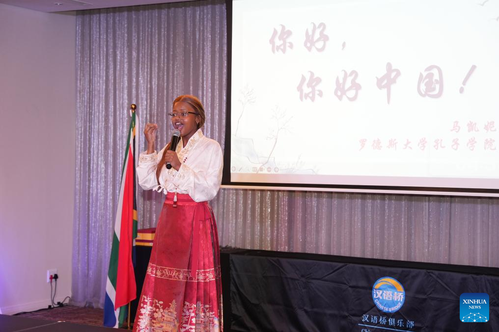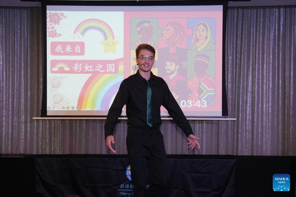 A contestant gives a speech during the South Africa finals of the 24th "Chinese Bridge" Chinese Proficiency Competition for Foreign College Students in Cape Town, South Africa, on May 30, 2025. The South Africa finals of the 24th "Chinese Bridge" Chinese Proficiency Competition for Foreign College Students took place on Friday in Cape Town, the country's legislative capital, where participants showcased remarkable language abilities and cultural talents. (Xinhua/Wang Lei)
