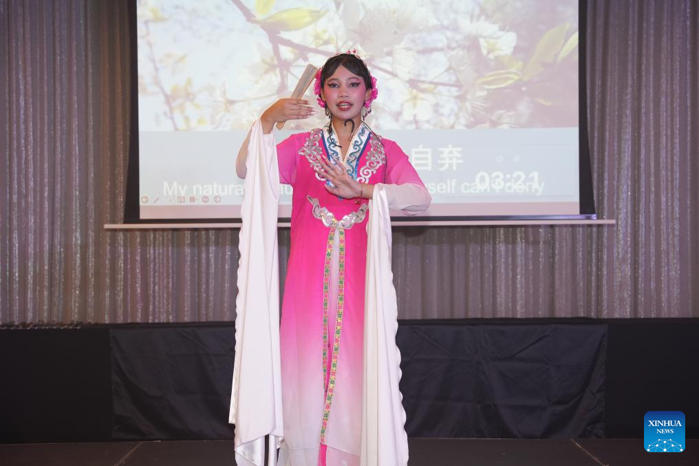 A contestant performs a talent show during the South Africa finals of the 24th "Chinese Bridge" Chinese Proficiency Competition for Foreign College Students in Cape Town, South Africa, on May 30, 2025. The South Africa finals of the 24th "Chinese Bridge" Chinese Proficiency Competition for Foreign College Students took place on Friday in Cape Town, the country's legislative capital, where participants showcased remarkable language abilities and cultural talents. (Xinhua/Wang Lei)