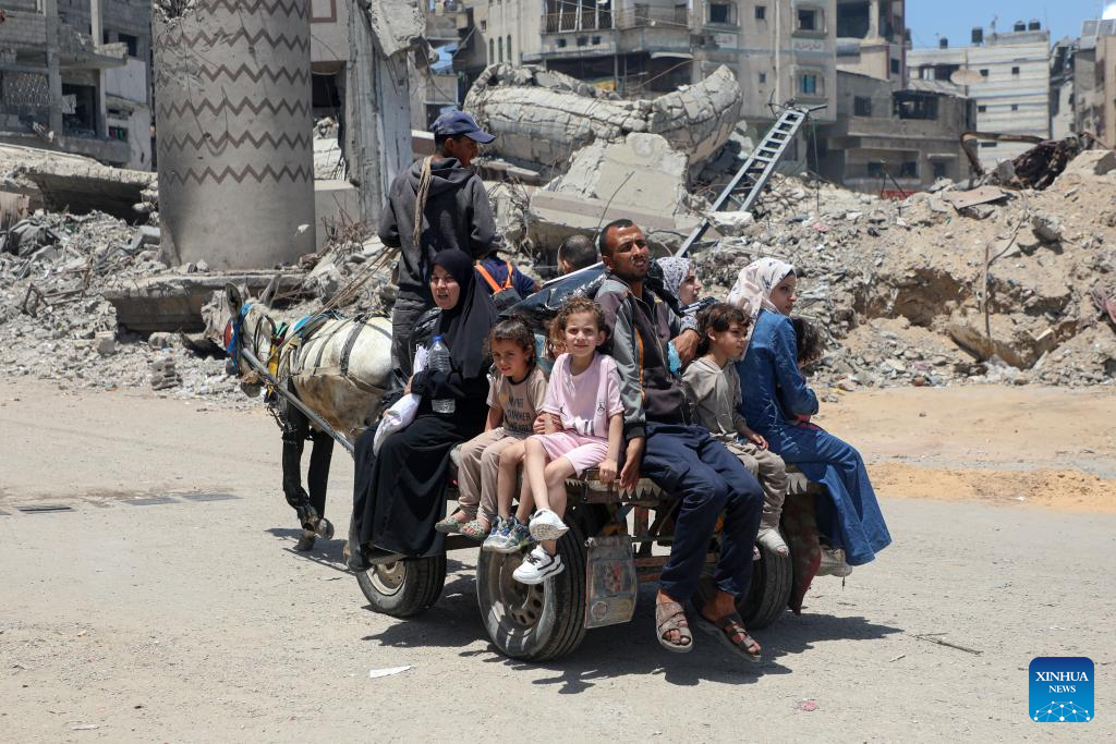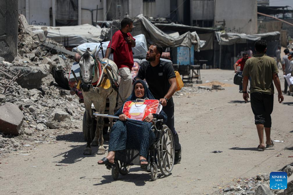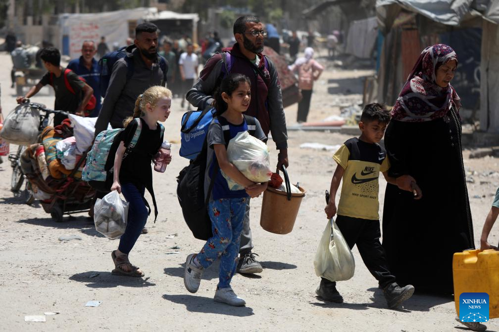 Displaced Palestinians walk on a street in Jabalia refugee camp, as they flee with their belongings from Jabalia area in northern Gaza Strip to central and western Gaza City, on May 30, 2025. (Photo by Rizek Abdeljawad/Xinhua)