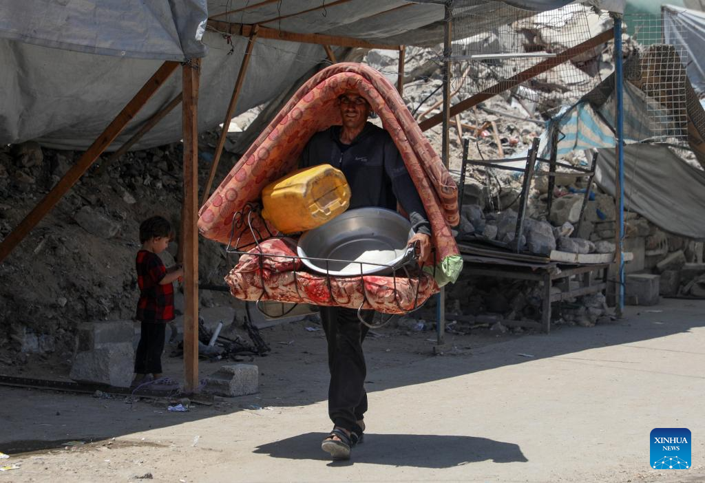 A displaced Palestinian walks on a street in Jabalia refugee camp, as he flees with his belongings from Jabalia area in northern Gaza Strip to central and western Gaza City, on May 30, 2025. (Photo by Rizek Abdeljawad/Xinhua)