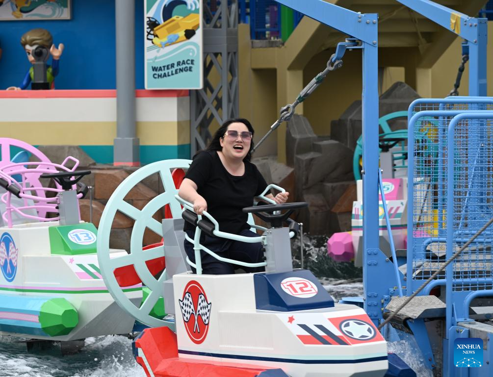A visitor enjoys herself at the LEGOLAND Shanghai Resort in Shanghai, east China, May 31, 2025. The resort began internal proof and trial operations Saturday, and is set to officially open to the public on July 5. (Xinhua/Chen Aiping)