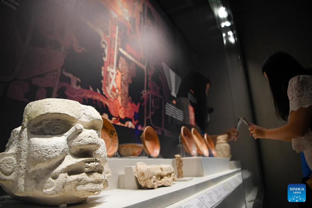 People watch exhibits at the exhibition "Mayas, Ceiba and Cosmos" at the Henan Museum in Zhengzhou, central China's Henan Province, May 30, 2025. The ongoing exhibition has attracted many visitors, offering them a unique opportunity to explore the resonances between the Chinese and Mayan civilizations and to enhance the cultural exchanges between China and Mexico. (Xinhua/Hao Yuan)