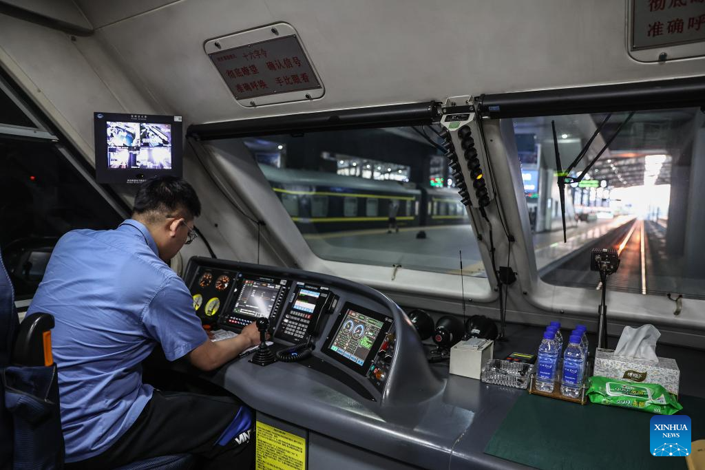 An inspection train is set to depart from Shenyang North Railway Station during a joint debugging and testing on the high-speed railway connecting Shenyang, capital of northeast China's Liaoning Province, and Changbai Mountain reserve in the neighboring Jilin Province, June 1, 2025. With a length of 430 kilometers and design speed of 350 kilometers per hour, the high-speed railway will significantly improve regional connectivity and boost tourism and economic development upon operation. (Xinhua/Pan Yulong)