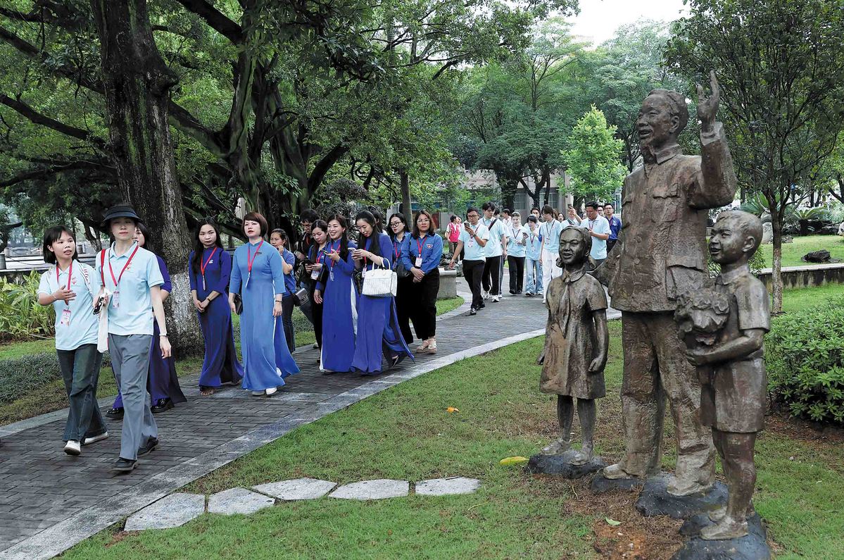 Chinese and Vietnamese youths walk past a statue of Ho Chi Minh, the late Vietnamese leader, on the campus of Guangxi University in Nanning, Guangxi Zhuang autonomous region, on May 18. (Zou Hong/China Daily)