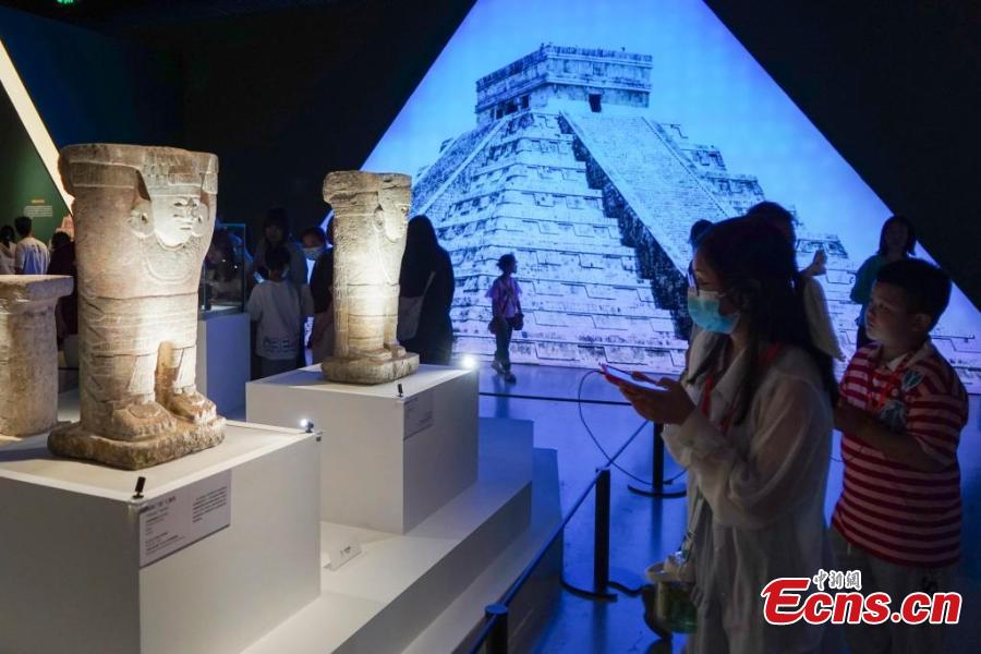 People view exhibits at the exhibition "Mayas, Ceiba and Cosmos" at the Henan Museum in Zhengzhou, central China's Henan Province, June 1, 2025. (China News Service/Fan Xiaoheng)
