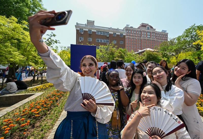 Students take selfies during the 8th International Culture Festival of Tianjin Foreign Studies University in North China's Tianjin, April 20, 2025. (Photo/Xinhua)