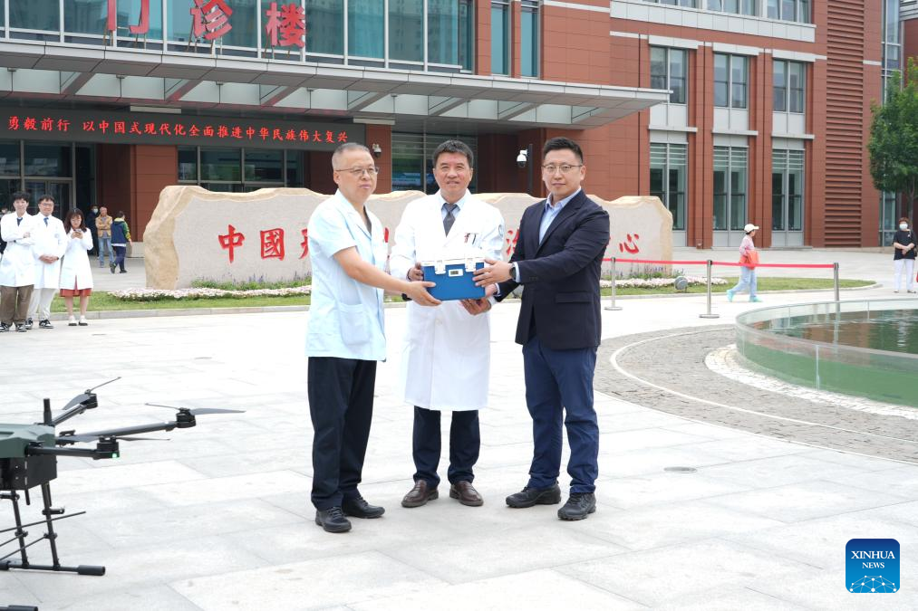 Shen Jun (C), vice president of Tianjin Medical University Cancer Institute and Hospital, receives emergency blood supply delivered by a drone during a simulated test flight at the hospital's Binhai branch in Tianjin, north China, May 21, 2025. (Xinhua)