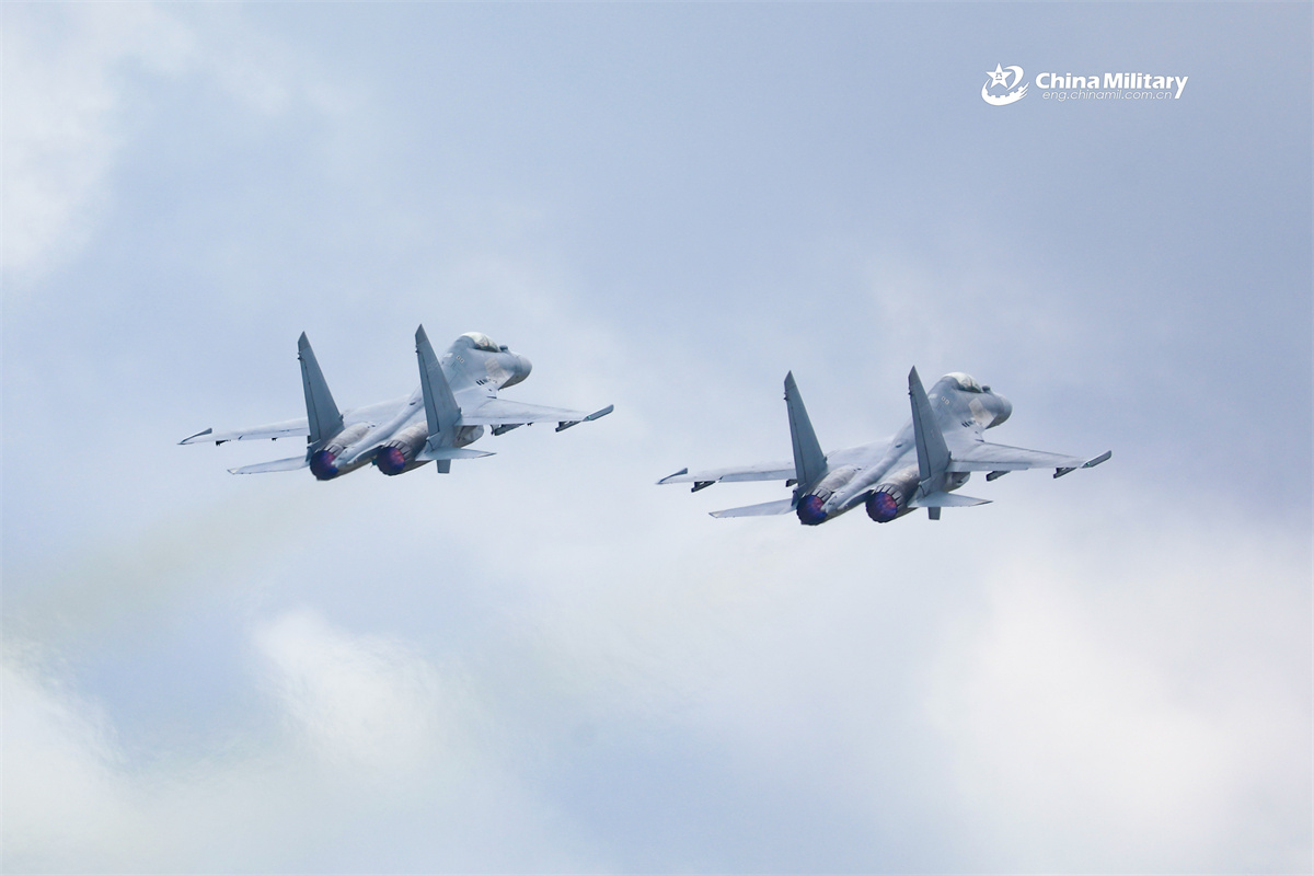 Two J-16 fighter jets attached to an aviation brigade of the air force under the Chinese PLA Southern Theater Command take off in formation during a multi-subject flight training exercise in late May 2025. (eng.chinamil.com.cn/Wang Xinwei)