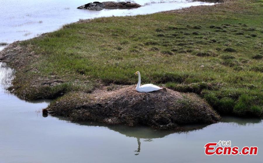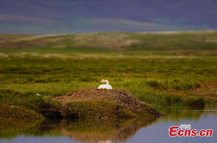 A swan sits on a nest at the Bayanbulak National Nature Reserve for nesting, Xinjiang Uygur Autonomous Region. (Photo/China News Service)