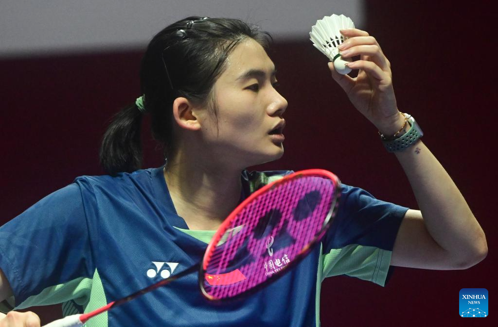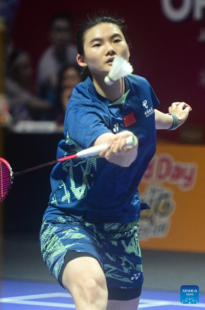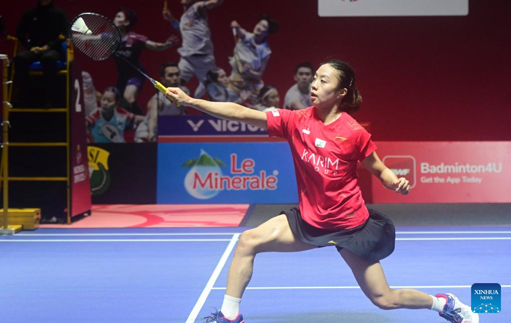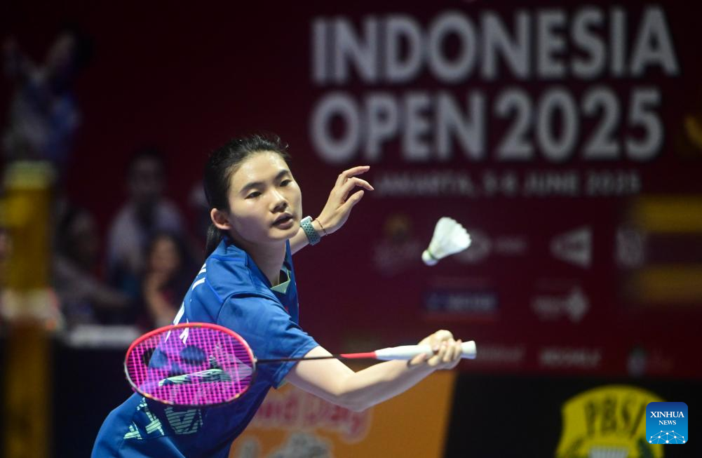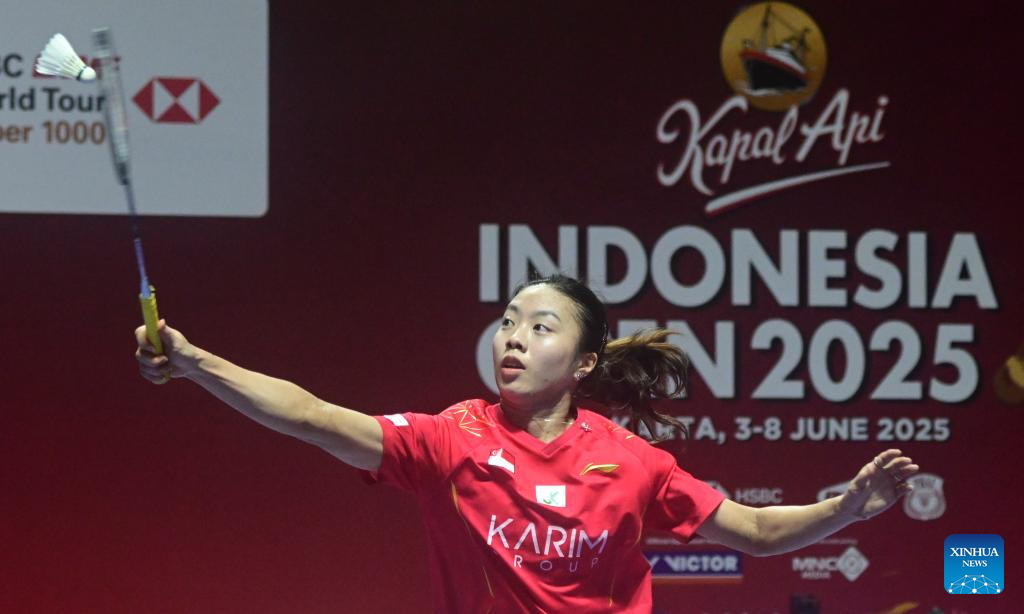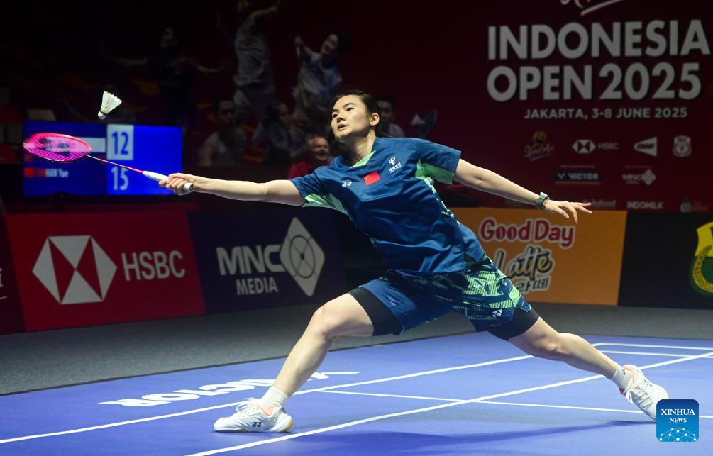 Han Yue of China hits a return during the women's singles first round match between Han Yue of China and Yeo Jia Min of Singapore at Indonesia Open 2025 in Jakarta, Indonesia, June 4, 2025. (Xinhua/Zulkarnain)